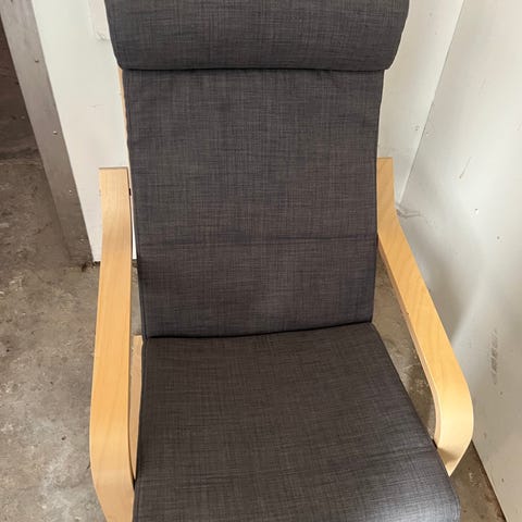 Poang rokkestol fra Ikea, sort træstel og lysgrå hynde. Nypris 1699 kr