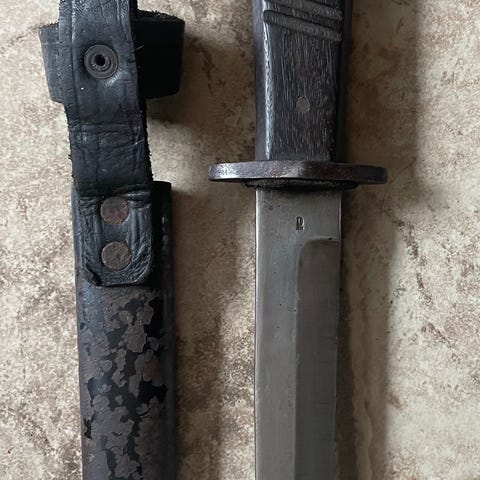 Har denne ældre kamp kniv, stemplet ENGLAN, hvad info jeg kan finde er det ihvertfald en gammel sag, så muligt den er fra tiden, rigtig gammel lædder skede.