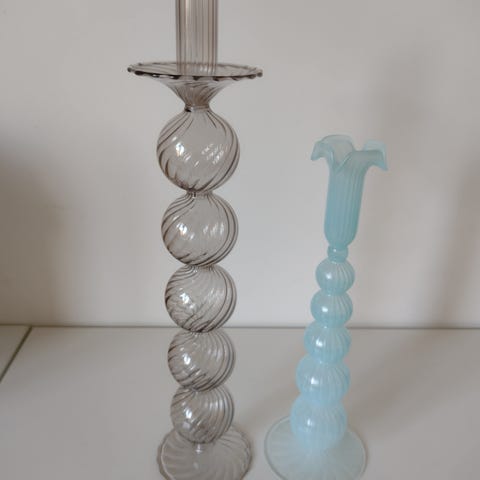 Smukke lysestager fra Anna+Nina i grønt glas med guld. 2 stk, ca 23 cm høje