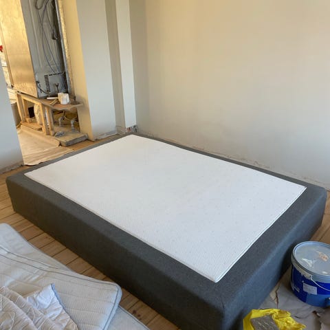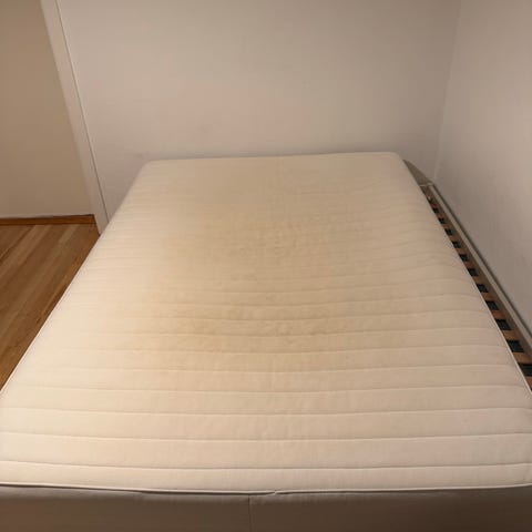 Stellet er stabilt og i pæn brugt stand, men har nogle kosmetiske skader nederst på siderne som vist på billederne, og er klar til brug – du skal bare tilføje din egen lamelbund og madras.