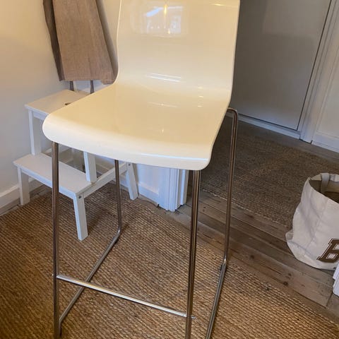 Har disse barstole. Stand varierer, de fleste i brugbar stand, en enkelt har lige et hul, og en enkelt mangler stangen til at hæve/sænke.