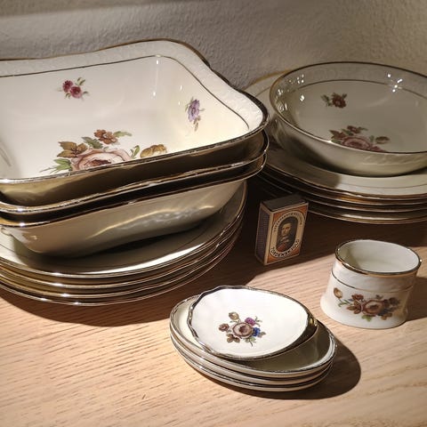 Tallerkener og kuvertaskebæger fra Københavns Porcellainsmaleri, antik