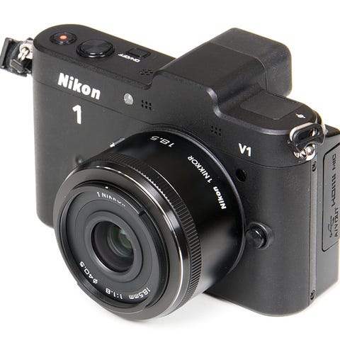 Nikon 1 kamera med tre objektiver: 10-30 mm f/3.5-5.6 VR, 10-100 mm og 70-300 mm f/4.5-5.6 VR. Kameraet og objektiverne er designet til fotografering med variabel brændvidde og billedstabilisering (VR). Løst håndtag og elektronisk søger - disse kan afmonteres. SD-kort, strop og lader.