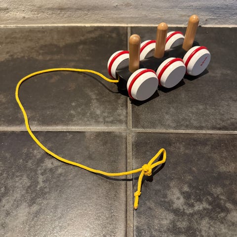 BRIO Trækvogn til børn i farverne rød og gul. Fremstillet i træ med hvide hjul. Designet til børns leg og transport af legetøj eller andre små genstande.