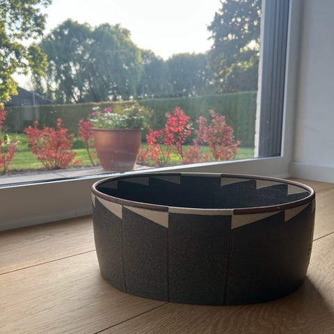 Stor rund skål i stentøj af Finn Cavling Clausen. Signeret. H: 16cm. D: 30cm