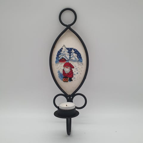Vægmonteret fyrfadsstage af sort metal fra Ateljé Margaretha. Med et indsat korsstingsbroderi med julemotiv.