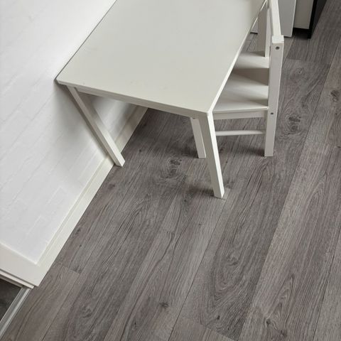 IKEA børnemøbelsæt i hvid bestående af et bord og en stol i hvid. Møblerne er designet til børn og egner sig til børneværelset eller legeområder. Ny pris 199 for bord og 129 kr for stol.