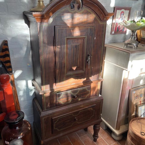 Træskab med en dør og en skuffe i lyst træ. Skabet har dekorative udskæringer på døren og toppen. Det er velegnet til opbevaring i hjemmet.