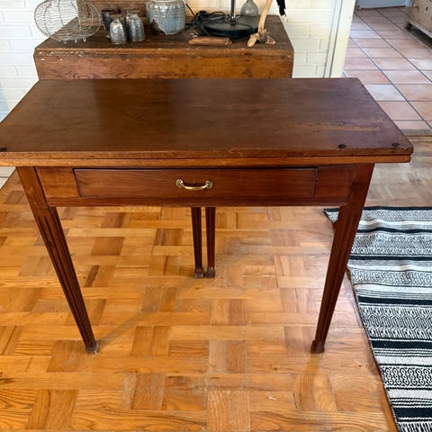 Ukendt mærke antikt træbord med en skuffe. Bordet har en mørk træfinish og ben i træ. Skuffen er foret med mønstret papir. Bordet kan anvendes som skrivebord eller sidebord.