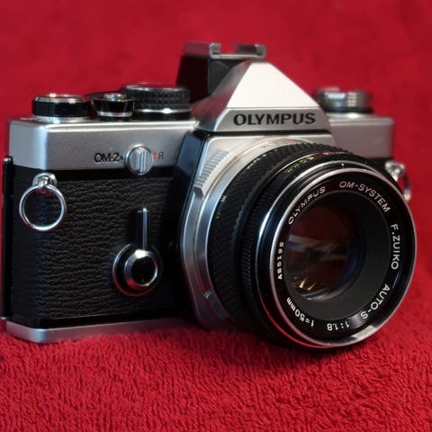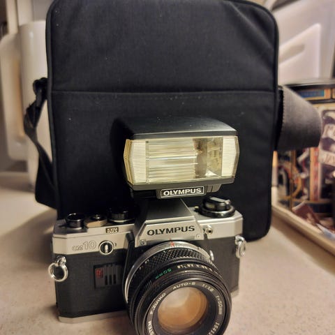 Olympus OM-10 kamera med tilhørende objektiv. Kameraet har manuel betjening og klassisk design i sort og sølv. Velegnet til fotografering med film.Virker som det skal.