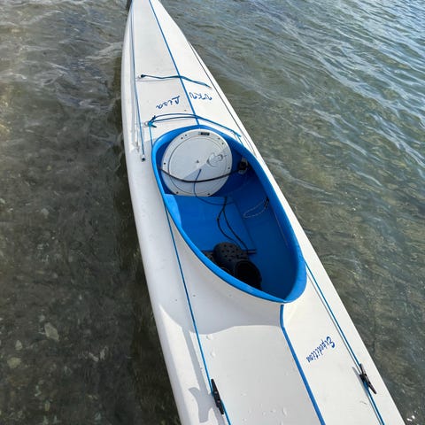 Stort set uden ridser og en rigtig lækker kajak. Der fortjener at komme på vandet. Den er sejlklar med pagaj og ror. Den kan godt ligge under juletræet😁