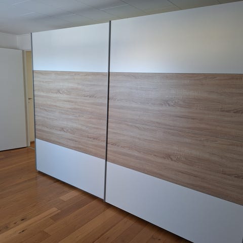 Skabet består af 2 sektioner fordelt på en skuffesektion (bredde 55cm) med 4 trådkurve og en hyldesektion (bredde 100cm) med 3 hylder. Begge sektioner har bøjlestang. Skabet er i meget god stand.
