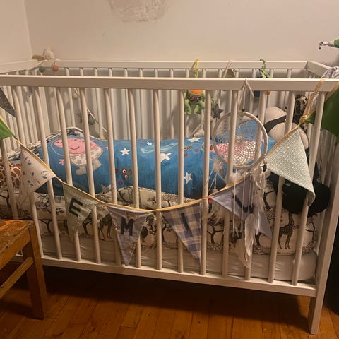IKEA Tremmeseng børneseng med tremmer i hvid. Egnet til spædbørn og småbørn. Sengen har en enkel og funktionel konstruktion med træramme og tremmer, der sikrer ventilation og sikkerhed for barnet.