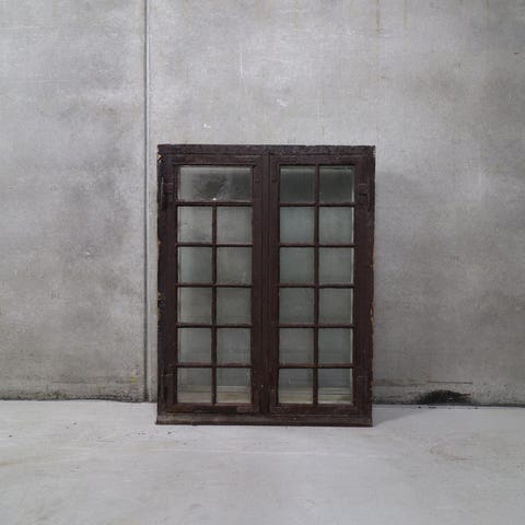 Gammelt sprosset vindue brugt som rumdeler i gipsvæg.
