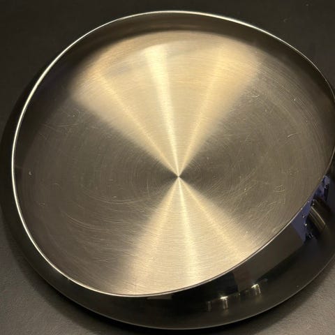 Georg Jensen skål i rustfrit stål med en blank overflade. Skålen har et unikt, organisk design med bløde kurver og en reflekterende finish.