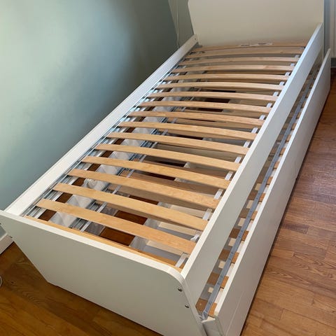Vi har to af disse. Der er madrasser med og en rigtig god seng, hvor det er nemt, at have en ekstra sovende og samtidig også med opbevaringsplads i skufferne.
