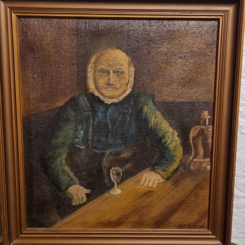 Signeret maleri af familie ved bord