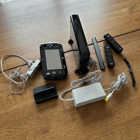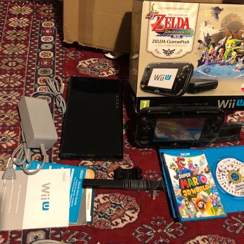 Nintendo Wii U konsol i The Legend of Zelda: The Wind Waker HD Premium Pack-udgave. Pakken indeholder konsol, controller, kabler og spil med tema fra The Legend of Zelda-serien. Konsollen har 32 GB lagerplads og understøtter HD-opløsning.