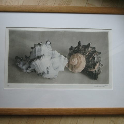 Sat i glas og ramme, monteret på brunt karton og bag brunt passepartout. Rammen har lidt små skønhedsfejl.