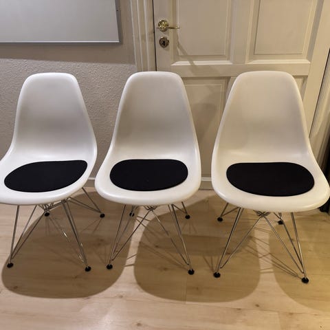 4 Originale Eames DSW glasfiber stole i cremefarvet med mørke træben.
