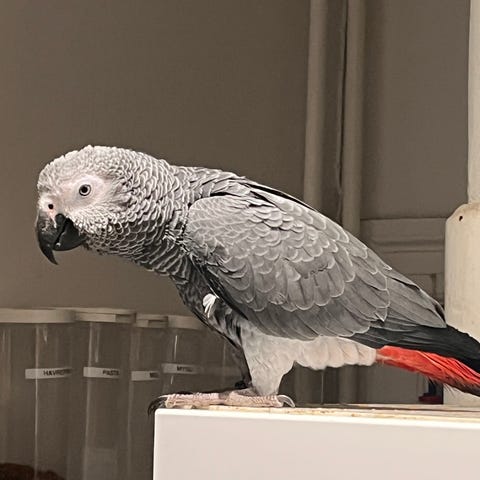 Det er med tungt hjerte, at jeg søger et nyt og kærligt hjem til min rødhalede grå jaco papegøje Simba.
