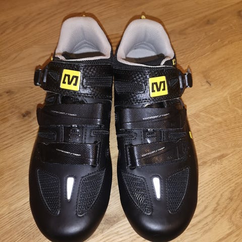 Mavic CXR Ultimate cykelsko i størrelse 43. Skoene har en hvid, sort og rød farvekombination med tre velcrolukninger og en spændejustering for sikker pasform. Designet til brug med klikpedaler, med en stiv sål for optimal kraftoverførsel. Materialet er holdbart og velegnet til cykling.