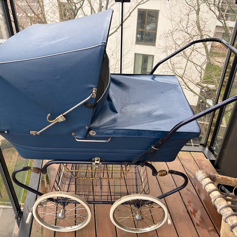 Stor Odder Barnevogn i grå farve med stor kaleche og robust stel. Vognen har justerbart håndtag, sikkerhedssele og opbevaringskurv under sædet. Designet til at give komfortabel transport af (flere) spædbørn og den har løse bundplader så der kan sidde flere lidt større børn i den. Vordende eller nybagte tvillingeforældre får den til halv pris.
