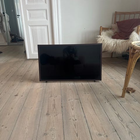 Samsung the frame 32” med trælook lister inkl både bordstander og væghæng så den kan komme helt tæt på væggen.