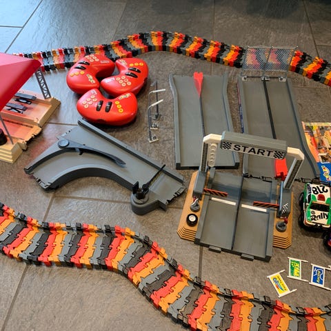 Racerbane med start- og målområde, pitstop og afkørsel til dette, skilte, 3 biler (kun to virker fejlfrit) og 3 remote-controls samt oversigts-hæfte.