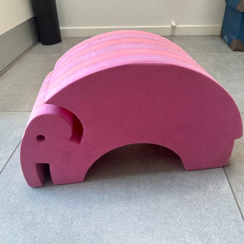 bObles elefant i str. S. Har taget billede ved siden af en elefant i str. L/stor, så man kan sammenligne størrelses forskellen. Blå i farven og fremstillet af skum. Der er en kat, der ikke har kunne lade den være, hvorfor der er en del brugsspor. Se billeder. Egnet til børn til leg og motorisk udvikling.