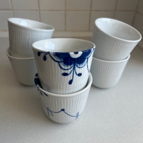 En rigtig flot samling hvid riflet thermokopper, de fleste er meget brugte, deraf prisen.
