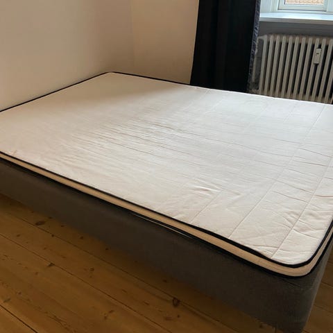 Skotterud boxmadras 140x200 som ny. 1 år gammel og brugt meget lidt. Mørkegrå på træben. Ny pris 5000 kroner.
