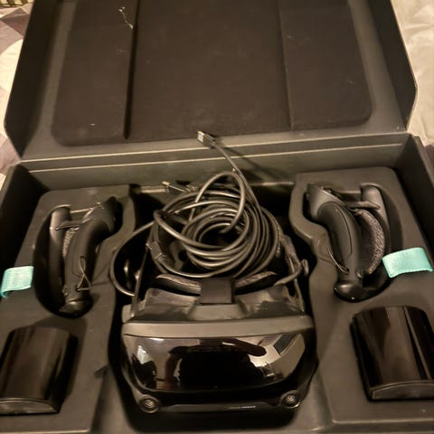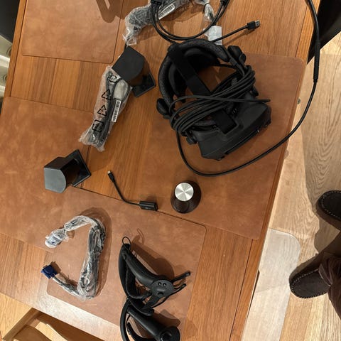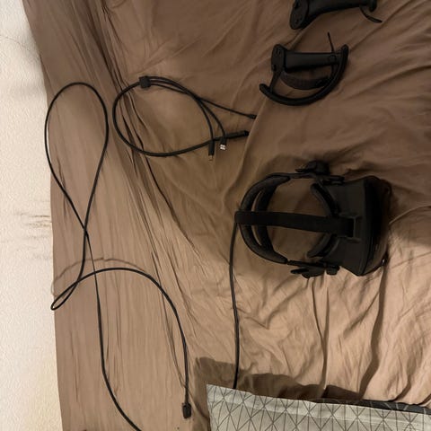 Valve Index VR Headset med tilhørende controllere og basestationer. Sættet inkluderer headset, to controllere og to basestationer, samt nødvendige kabler og strømforsyninger. Designet til virtual reality oplevelser med præcis bevægelsessporing.