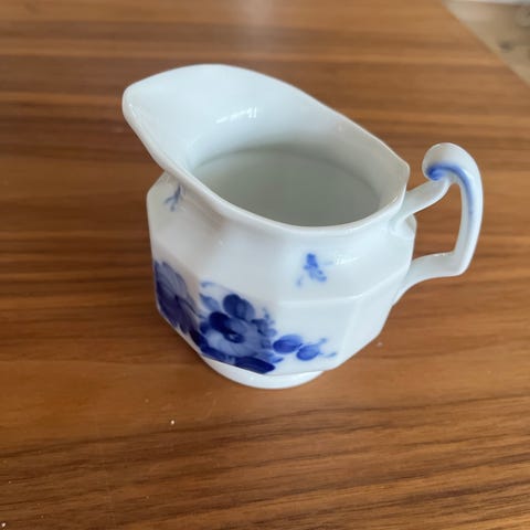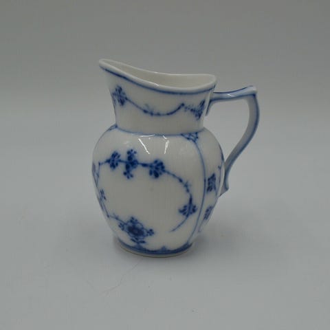 Kanden har et karakteristisk blåmalet mønster på hvid baggrund og er dekoreret med fine rifler.
