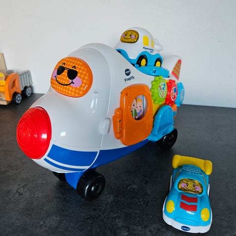 Vtech fragtfly incl. flyvemaskine med forskellige lyde - kan åbnes og pakkes sammen igen. Legetøjet kan også bruges hver for sig. Klar til masser af timers leg