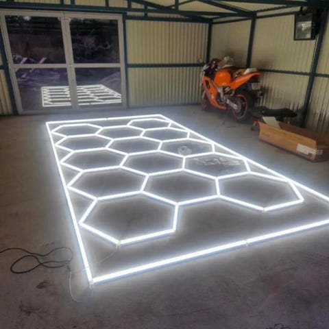 Hexagon LED loftslamper med sekskantet design, velegnet til installation i garage eller værksted. Lamperne har et moderne udseende med klart, hvidt lys, der giver god belysning til arbejdsområder.