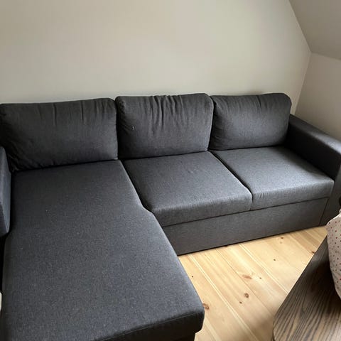 Sælger grå sovesofa, som kan slås ud til seng.