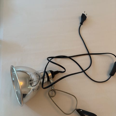 Arkitektlampe i rød metal med justerbar arm og stor rund lampeskærm. Designet til at blive fastgjort på bord eller skrivebord med en klemme. Passer til brug i kontormiljøer eller til læsning ved skrivebordet.