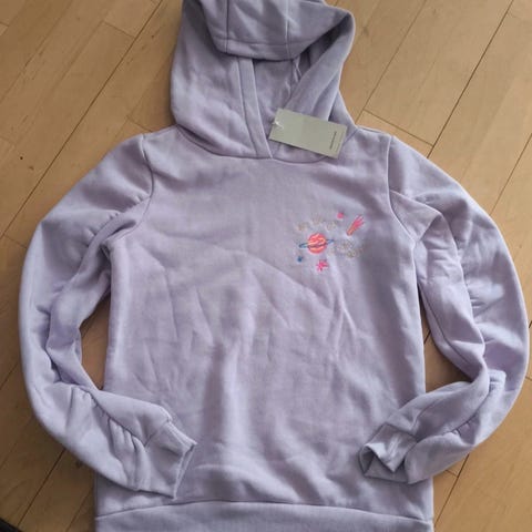 Flot bluse i str. 146/152 med blondestykke ved halsen og ærmerne.