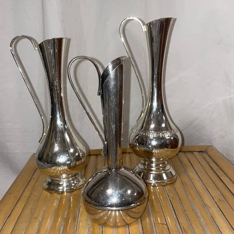 al pacca sølv / tysk sølv. Sæt med kande, sukkerskål og flødekande. Stor kande højde 21 cm. Lille kande 8,5 cm. Skål 8 cm. Vintage. Stilfuldt og elegant. Skal pudses. Sender gerne . Prisen er for alle 3 dele samlet. Kontakt venligst via DBA.