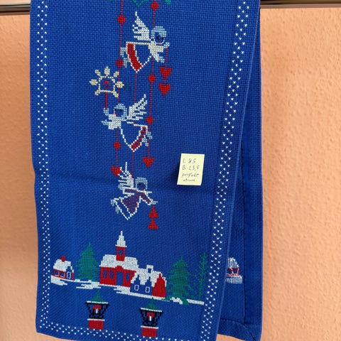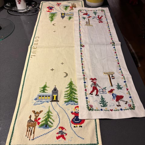 2 næsten ens bordløbere med motiver af bla. julestjerner, broderet i korssting , kantet og sømmet op. Meget fint håndværk