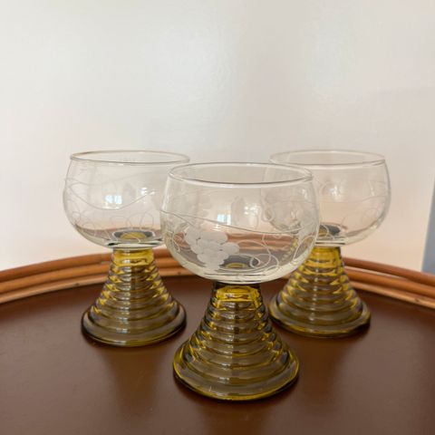 Glas, Römerglas, Fine grøn gule römerglas, 7 med riller på fod og vinløv med 20 druer. Resten er solgt