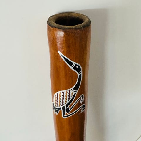 Traditionelt didgeridoo lavet af træ med en længde på 61 cm. Instrumentet har indgraverede dekorative mønstre og er delvist indpakket med sort snor ved mundstykket. Didgeridooen er et blæseinstrument, der bruges til musikalske formål. Er oprindeligt fra Australien.