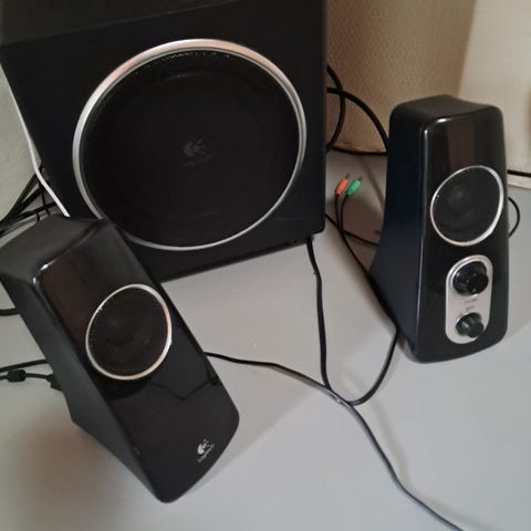 Logitech højttalere sæt i sort farve. Består af to enheder med tilhørende strømforsyning. Egnet til brug med computere og andre lydkilder. Brugt en enkelt gang.