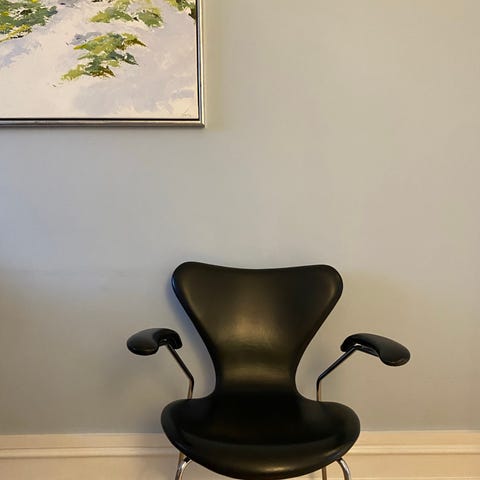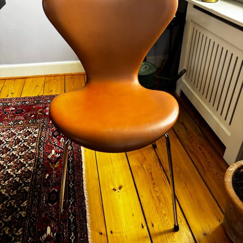 Arne Jacobsen stole produceret af Fritz Hansen model 3107 - 195. Når kvalitet og unikt design ses på lang afstand. Skønne sjældne syverstole i cognacfarvet læder polstring indvendig og dertil sort skal med messingben. Prisen er opgivet pr.stk.
