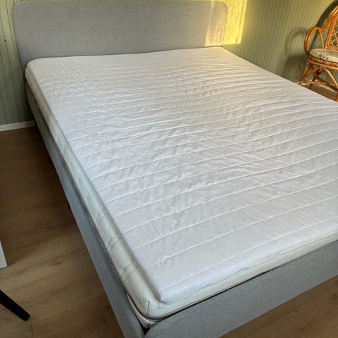 To stk enkelt senge, samlet mål 160x200. Medfølger topmadras fra ikea, rullemadras fra Dreamzone og kappelagen.