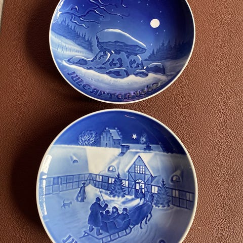 Bing & Grøndahl juleaften juleplatte med motiver fra årene 1962, 1984 og 1972. Platterne er dekoreret med traditionelle julemotiver i blå og hvide farver.