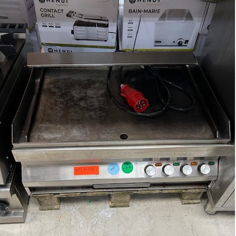 Elektrisk støbejern stegeplade med metaloverflade og justerbar temperaturkontrol via drejeknap. Udstyret med indikatorlamper for drift og varme. Velegnet til madlavning på flad overflade.