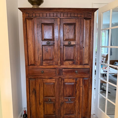 Ældre vægthængt vitrineskab med glas låge og skuffer