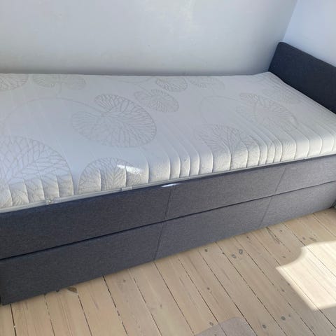 Se mål på billede 5. Sengen er halvandet år gammel. Madras til udtræksseng følger med. Den er købt sammen med sengen så den er ikke brugt ret meget. Skifter den kun pga vi har brug for en større seng.